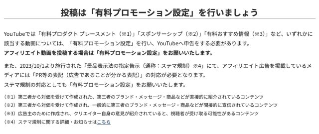 「有料プロモーションの設定」とは、YouTubeでアフィリエイトや企業案件をするときに、視聴者に対してその旨を伝えるための設定のことです。