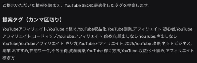 YouTube動画に最適なタグを500文字以内で提案してください。 カンマ区切りで出力し、最後に各タグを選んだ理由を簡潔に説明してください。