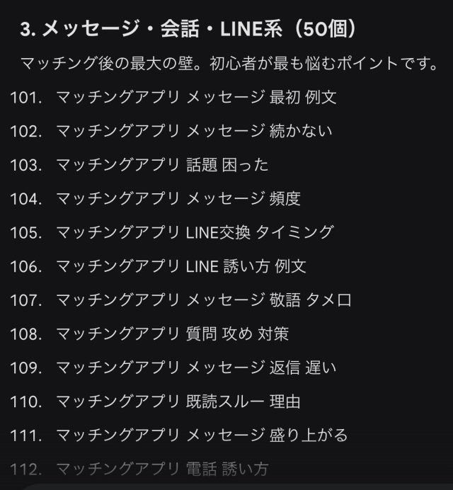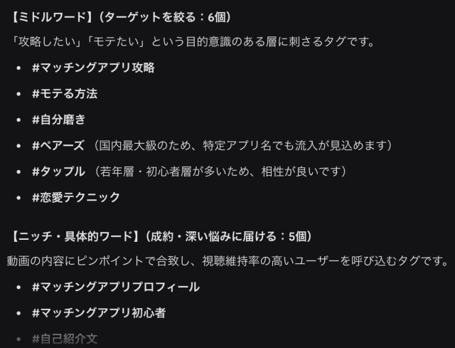 ・「検索ボリュームが大きいビッグワード」「中規模なワード」「具体的でニッチなワード」をバランスよく含めてください。