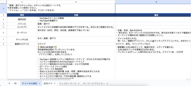 私のYouTubeチャンネル「まさ|副業・脱サラ」で使っているチャンネル設計シートを無料でプレゼントします。サイト下のメルマガに登録すると受け取れます。