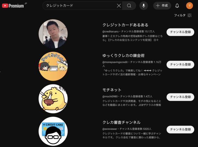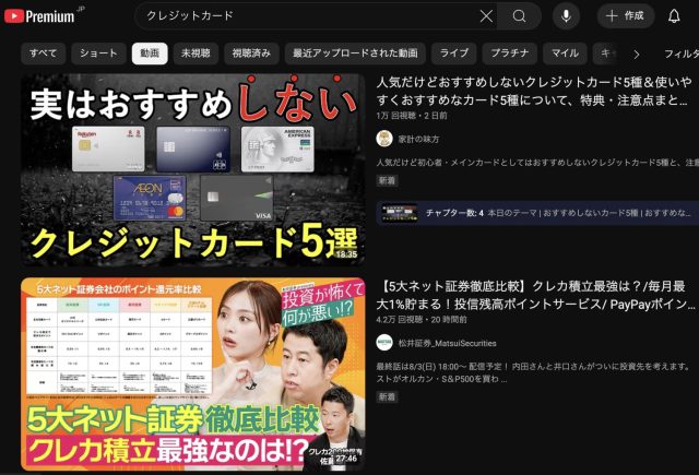 例えば、クレジットカードのジャンルで発信するなら「クレジットカード」で検索します。競合の動画がずらっと出てきます。