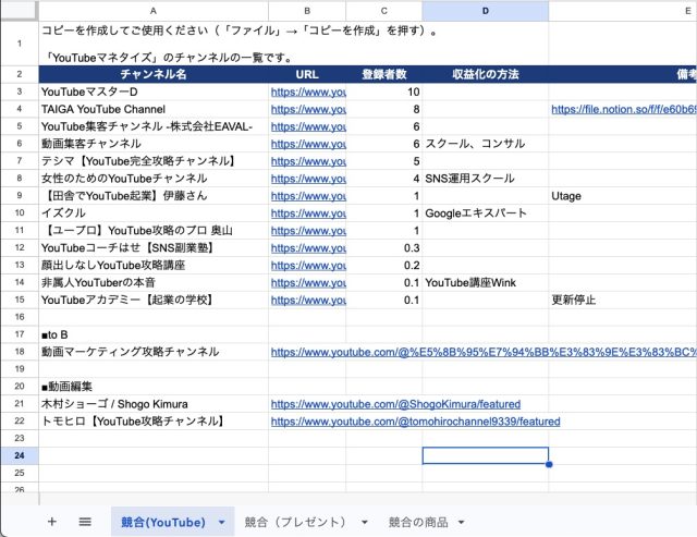 私が使っている競合調査シート(Googleスプレッドシート)をプレゼントします。