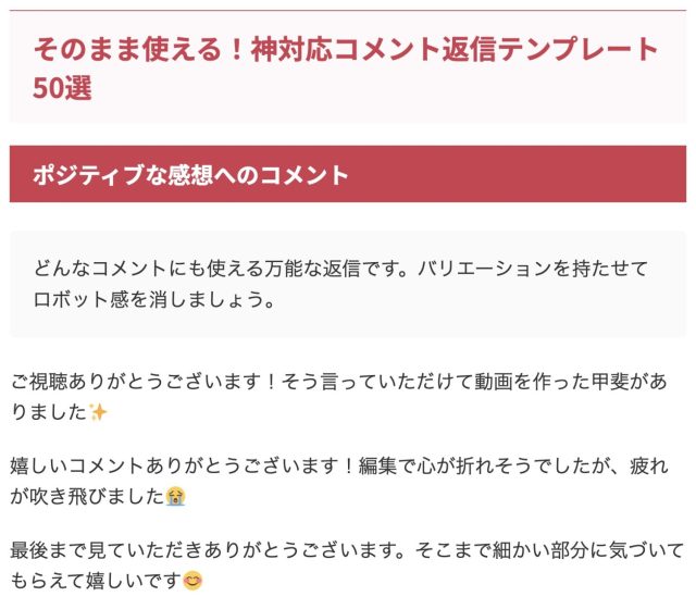 そんなあなたのために、コピペでそのまま使える「神対応コメント返信テンプレート50選」を作りました。