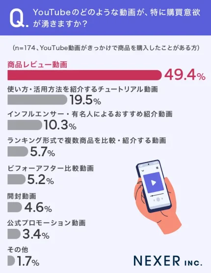 1位は商品レビュー動画でした。49.4%で圧倒的に1位です。