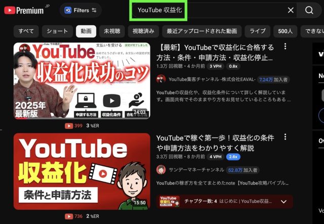 例えば、YouTubeで「YouTube 収益化」で検索したとします。 その時に、たくさんの動画が順番に並びますよね。 この順番の上の方に自分の動画を表示させることをSEO対策と言います。上の方に表示されるほど動画の再生数が増えやすくなります。