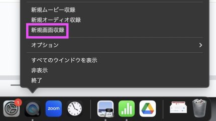 QuickTime Playerのアプリを右クリックする。「新規画面収録」を押す。