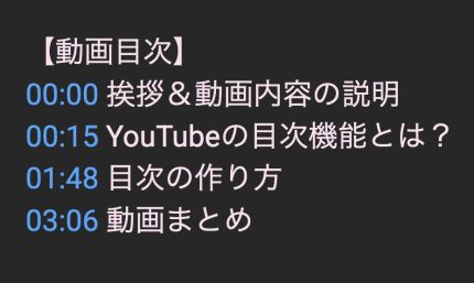 - 動画に目次(チャプター)をつける時:説明欄に時間を書いておくことで、視聴者がワンクリックで見たい場所へ飛べるようにする。